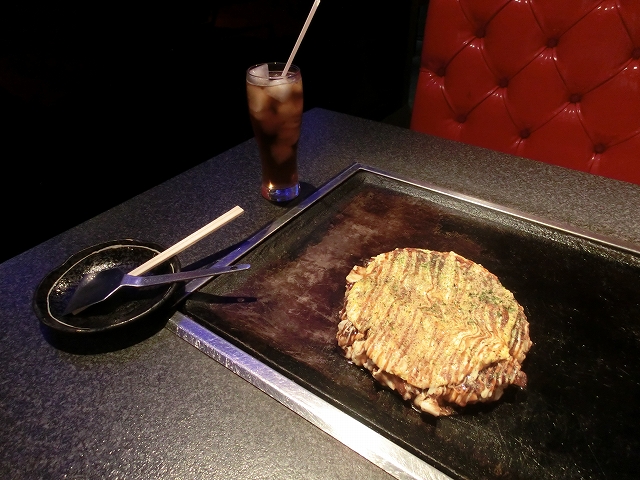 「鬼手佛心燒」是長長的摩登燒。在加入豬肉的炒麵飯(炒飯)裡放入半熟蛋還有很多的豬肉,份量十足。獨特的造型是以居酒屋的長型碟子為原型。藏田先生不管和風還是洋風,至今仍參考各式料理,努力的開發菜單。當然在菜單之中,也有上一代創業當時就留下來的豬肉大阪燒(480圓日幣)、烏賊大阪燒(480圓日幣)。