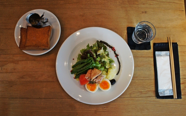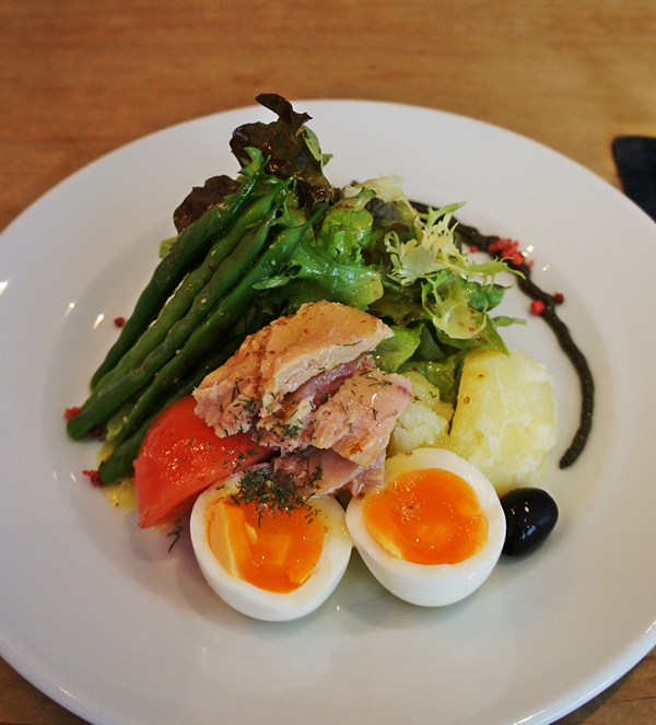 我這次點了民族風沙拉、奶油蜂蜜黑麥麵包、烤草莓水果塔跟奶茶。民族風沙拉是「CICOUTE CAFE」的經典料理代表,在這裡漂亮的重現了這道菜,鬆軟的馬鈴薯、菜豆、清脆鮮綠的蔬菜、火侯恰到好處的半熟蛋加上鮪魚跟黑橄欖,再搭配紅胡椒粒和橄欖醬就變成Cafe de LENTO風沙拉,美味程度又更上一層。![]()