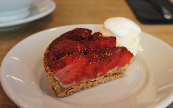 旁邊放上一球冰淇淋的特製水果塔,有焦糖蘋果、起司、烤草莓三種選擇。經過烘焙的塔皮香味撲鼻,酸酸甜甜的草莓加上杏仁奶油的組合相當出色,跟使用新鮮草莓有不同的美味。