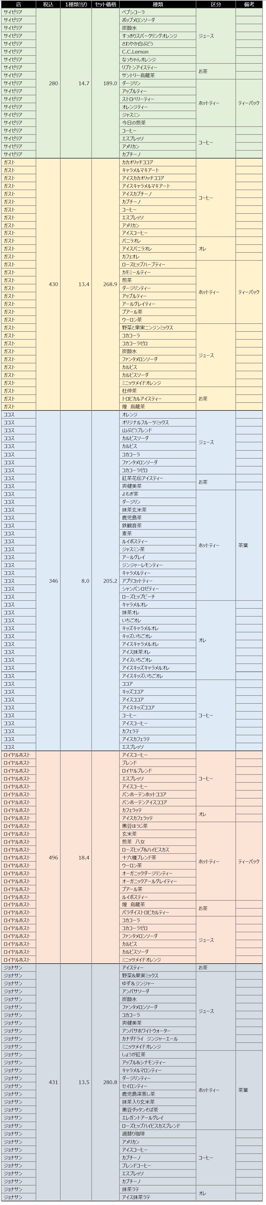 連鎖店的不同,飲料吧的內容也相當多元化。希望你可以利用這個調查,隨你的心情「只要便宜就好」,「今天我想喝熱茶」,「我現在好想喝歐蕾哦」等等來選擇適合你的家庭餐廳哦!(附錄)有了這個就可以放心了!每家連鎖酒店餐廳的飲料吧一覽2015年3月時的各個家庭餐廳的飲料種類一覽表都在這裏! 不知道該如何現在的時候,請多多利用哦!