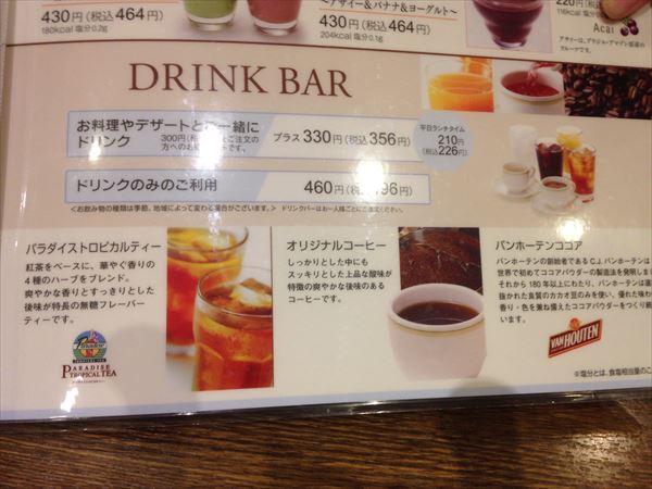 飲料吧加套餐的話是270円(加稅),單點竟然是430円(加稅)。哇喔!比想像種還貴呢。有香草歐蕾呢!