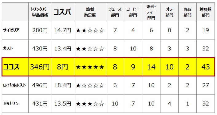 筆者的満足度最高的,單價也最便宜的,就是COCO’S了!不是只有種類,連飲料的品質也很高。老實說,其他的家庭餐廳根本不能跟COCO’S相比呢!【從飲料吧看到如何選擇家庭餐廳】