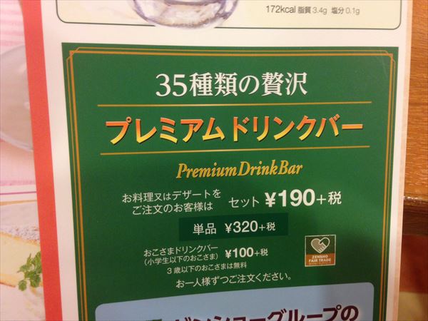 「哇!這個抹茶好濃哦……這個即使在京都也可以賣吧! 我想!」我一個人在飲料吧前面興奮的想著。COCO’S的飲料吧,品質太好了!其他的飲料也很多,果汁有8種,咖啡有9種,熱茶(葉)有14種,歐蕾有10種,加上2種日本茶,竟然有43種的飲料呢!●COCO’S・筆者感想:它全體都很優,尤其是茶跟歐蕾更是高品質! 沒想到飲料吧會有這麼不同! 價錢也在400円以內,真的很划算!