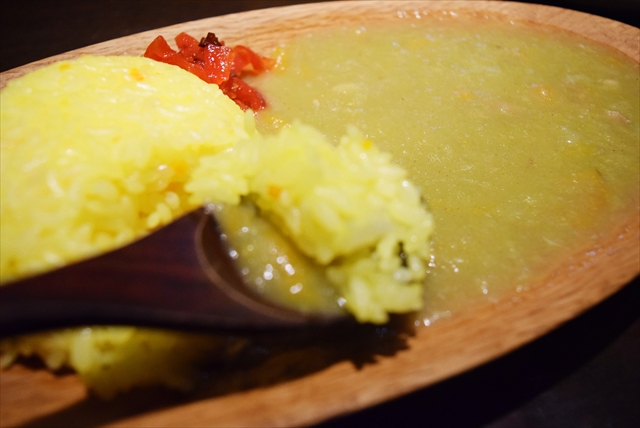 這裡所製作的哈密瓜咖哩,所選用的哈密瓜品種是以「貴美哈密瓜」、「昆西品種」、「乙女哈密瓜」等三種混合而成。加上蔬菜以及咖哩香辛料、麵粉等一起翻炒。咖哩內的水分完全來自蔬菜及哈密瓜。白飯則是選擇加入奶油烹煮的奶油飯。一匙入口,咖哩醬雖然富有果肉感,卻比預期的甜度更低。非常清爽順口的口感。特製的香料讓口中帶些微微的辛辣。