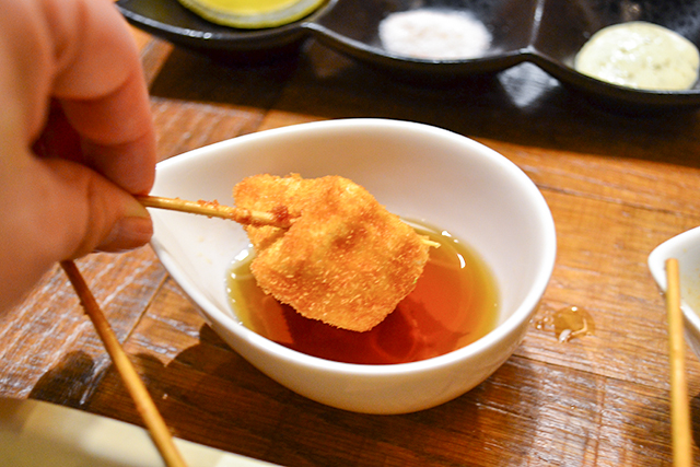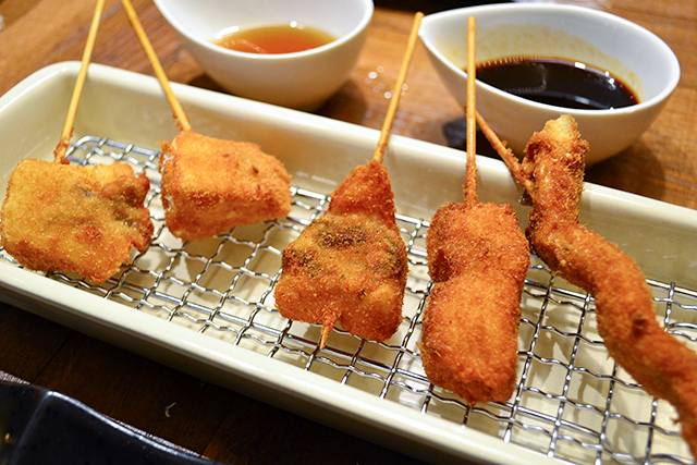 這間酒吧位於從二重橋前站地下連接著丸之內PLAZA。店名是「炸串物和酒之店 SABOTEN BAR」。炸串物!原來如此,不是炸豬排而是炸串物。看樣子是沒有搞錯。