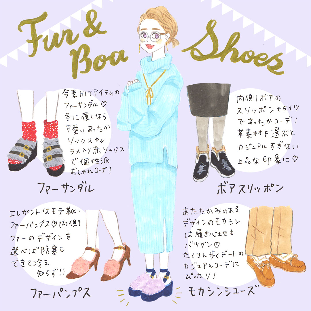 從夏天尾聲開始就很受歡迎的毛毛涼鞋,冬天也只要搭配溫暖的褲襪或襪子就還可以再穿好一陣子! 肯定可以成為厚重冬季穿搭中的可愛亮點沒錯♪ 加上毛毛來增添韻味的淑女鞋也一樣,只要是在鞋子內側也黏有毛毛的款式就很推薦在冬天穿。搭配單寧等長褲做休閒穿搭,也很可愛唷♡
