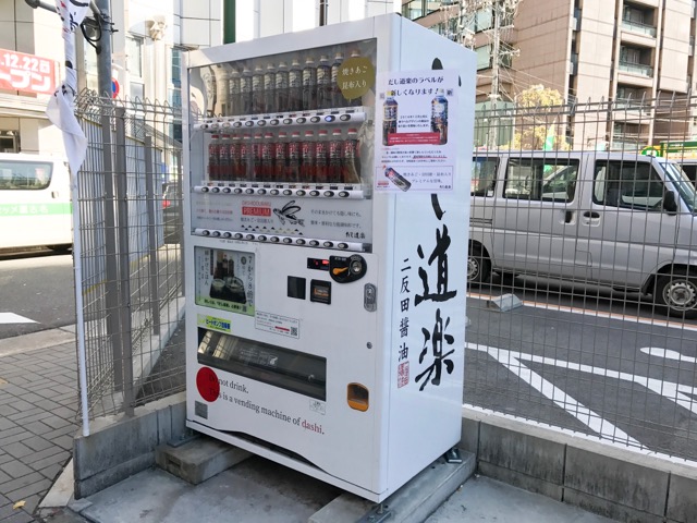 位於廣島縣吳市的「烏龍麵店 湯頭道樂」是二反田醬油直接經營的烏龍麵店。這家店引以為傲的是放進整個被稱作「下巴」之用炭火烤過的飛魚「烤下巴」與「昆布」的「湯頭道樂 烤下巴」。這個「湯頭道樂」,據說可以在自動販賣機買得到! 雖然這麼說,但有賣的也只有少數的自動販賣機。這次,前去尋找這個「湯頭道樂」的自動販賣機。設置在普通停車場的「湯頭」自動販賣機