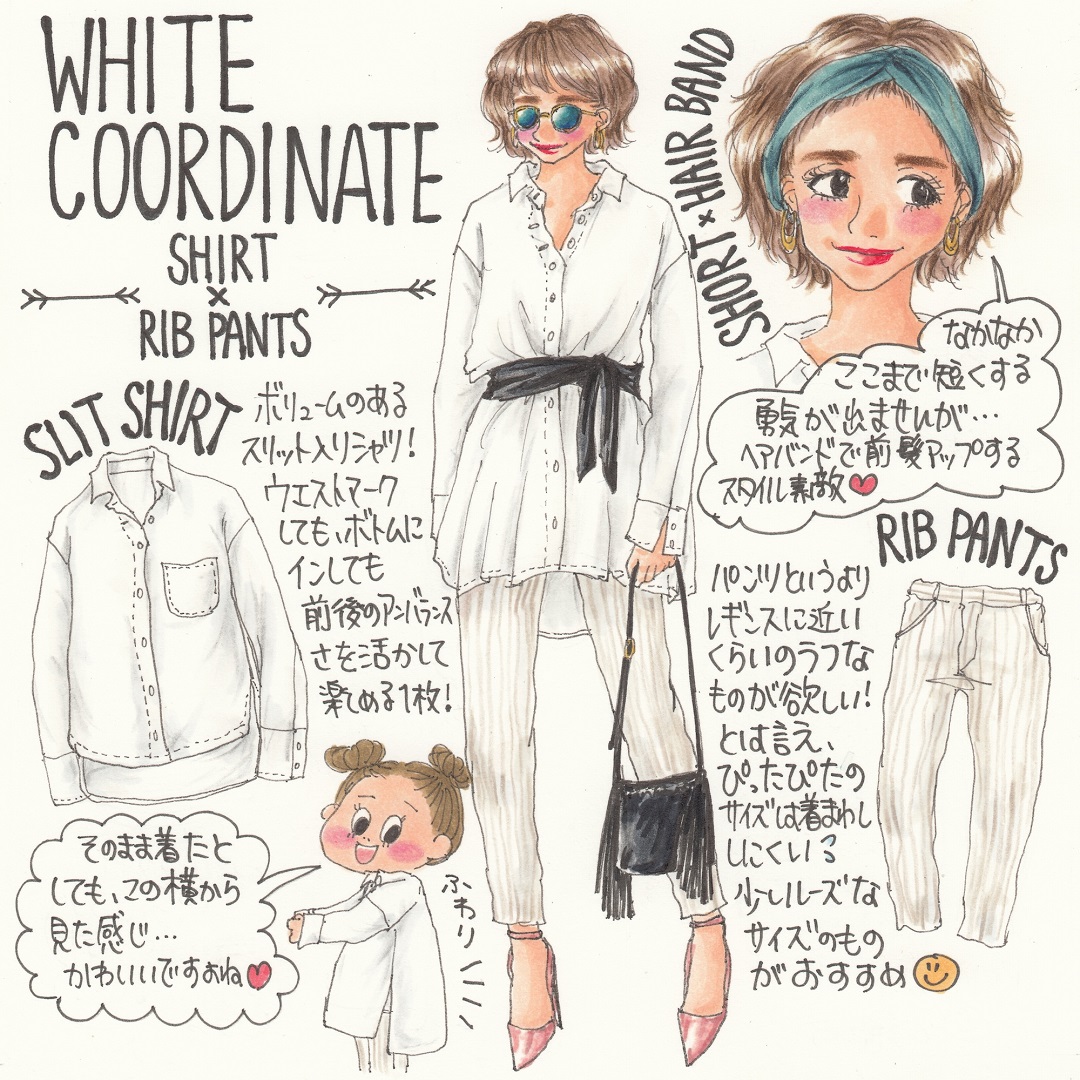 全身白色單品! 這種打扮感覺好像會變得既沒重點又邋遢,所以大家動不動就會認為很難駕馭。但是只要靠著在某個部位加件小東西畫龍點睛,我想如此一來,就能夠營造出信手拈來的隨性風格,又不至於給人刻意打扮的感覺♪ 希望可以成為您的參考。