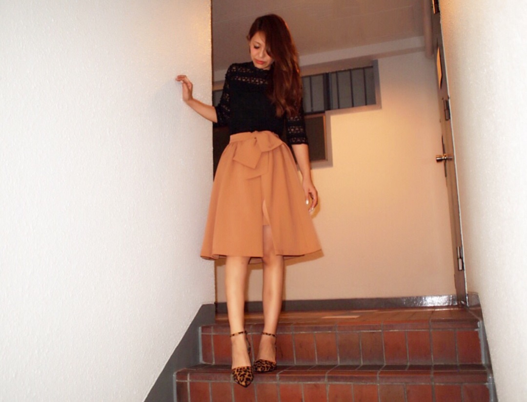 這次是用駝色設計款裙子搭配整件都是蕾絲的黑上衣。即使裙子的設計本身太過可愛,但如果是駝色便會顯得成熟,如果是粉紅色便會展露出約會也適合的女人味氣氛,根據所選的顏色就能一口氣改變印象。各位也請務必以下半身單品為中心,試著享受一下不同穿搭的樂趣喔♡(弓削沙織)