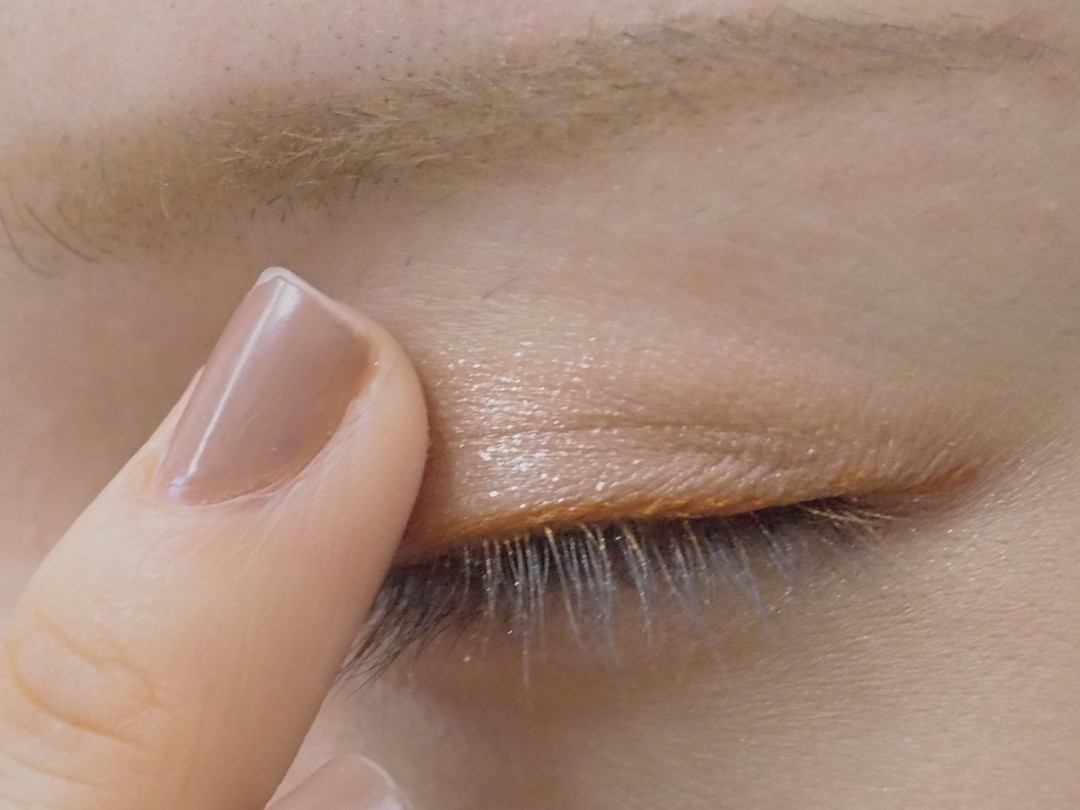 為了不干擾身為此次主角的橘色眼線之顯色效果,因此眼瞼部分的重點在於,要選擇不突出、容易融入膚色的單一顏色做為底色。