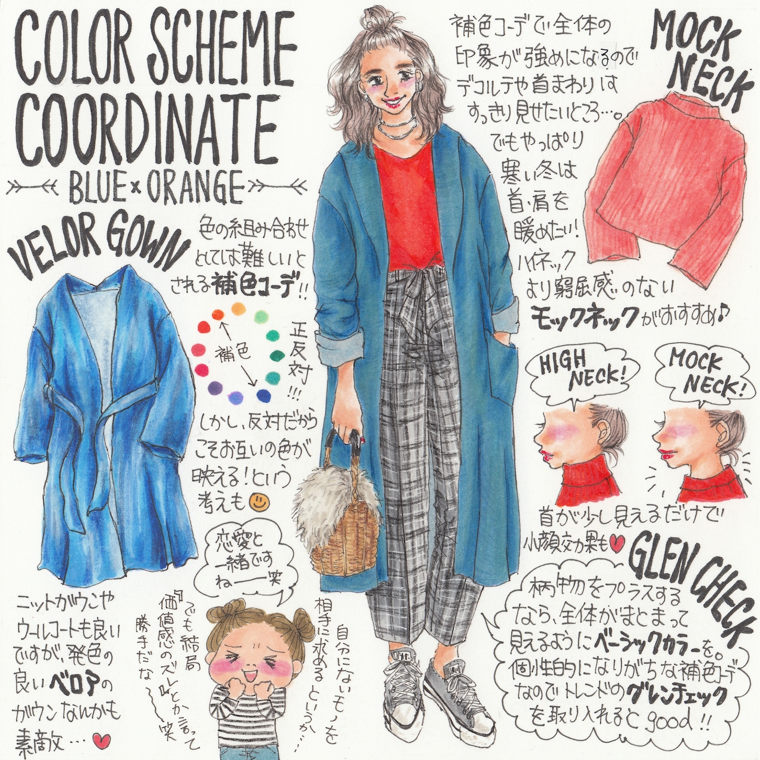 另外,由於外套所佔面積較廣,所以若外套部分選擇藍色單品,搭配的橘色部分就會相對變少! 類似這樣,藉著比例分配來達到平衡感,如此一來橘色等於是當反差色來使用,雖說是互補色穿搭但就變得十分簡單♪下半身以及小東西就以基本色為佳◎