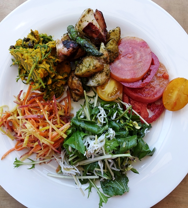 白色盤子上五顏六色的食物拼盤是以蔬菜為主,採用當季的無農藥蔬菜與小坪當地的海產。