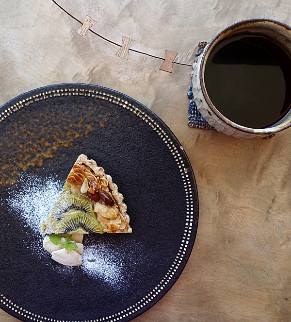 自家烘焙的現磨咖啡與香味四溢的烤奇異果餡餅。