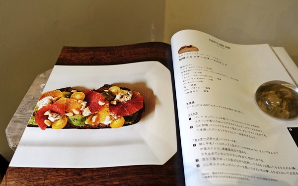 在此要向您推薦的是使用當季素材,1300圓附飲料的法式輕食午餐。飲料有手沖濾泡式咖啡、冰咖啡、紅茶、蘋果汁,另外竟也有白葡萄酒及紅葡萄酒可選。這一刻小編品嚐了使用水果的美麗法式輕食,這道是春季出版的《OPEN SANDWICH每日可口開放式三明治食譜集》當中的一品。![]()