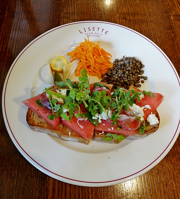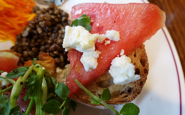 色彩繽紛挑逗食欲的西瓜法式輕食也像是一道甜點。白葡萄酒醋醃漬的西瓜、西洋菜、菲達起司、帕爾瑪火腿組成拼盤。帕爾瑪火腿及菲達起司的鹹味與甘甜多汁的西瓜絕妙搭配,吃了似乎會令人上癮。![]()