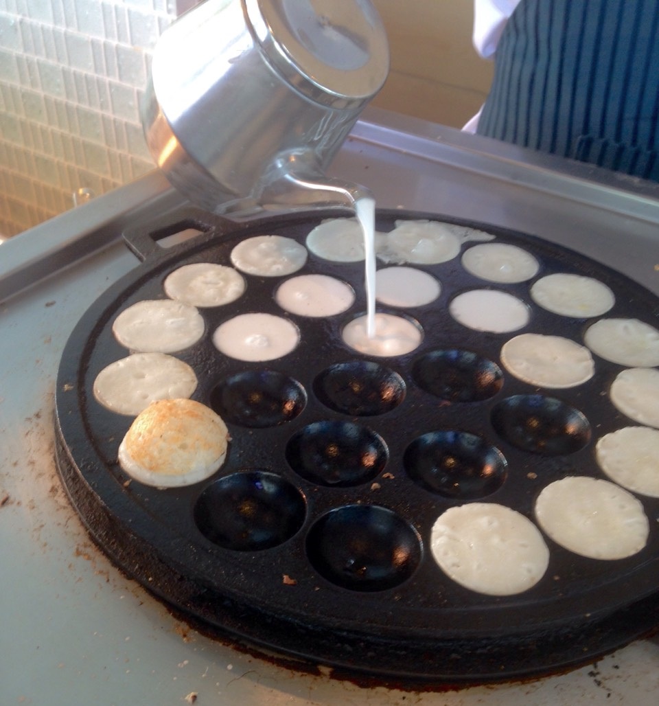 在類似章魚燒機器的專用烤盤上,將麵糊單面烤過,再把兩片合在一起享用,這便是「Khanom Krok」的吃法。