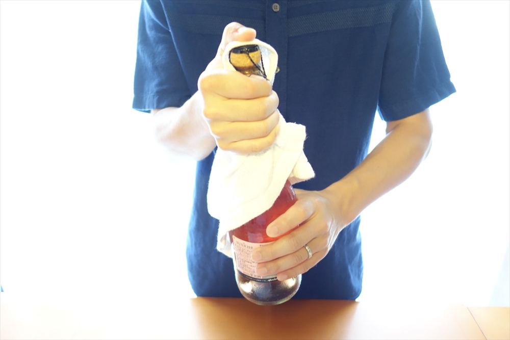 (3)按住軟木塞的手保持不動,邊轉動瓶身邊開瓶。 ※並非轉動軟木塞,而是轉動瓶身。