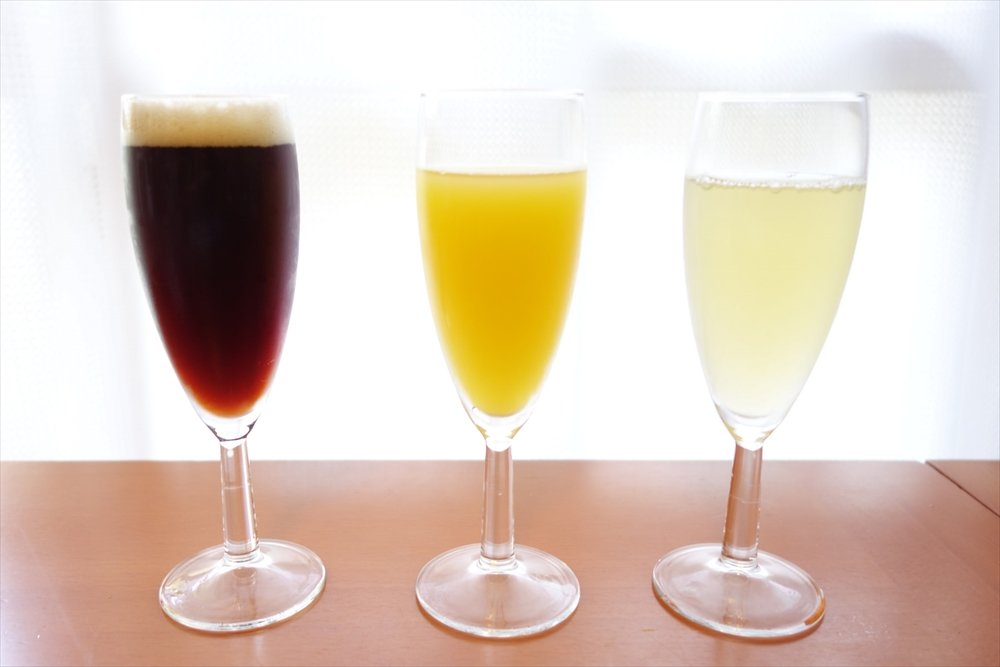 而“一開始不拆鐵絲”這件事也讓我覺得茅塞頓開。剛好前幾天在戶外BBQ想開汽泡酒時,剛拆掉鐵絲時軟木塞就飛超遠,裡面一半的酒都灑出去了。「鐵絲有著抑制軟木塞噴發的功能。如果先拆掉鐵絲,瓶內的氣體可能就會將軟木塞頂出去」(Mercian負責人)特別是當溫度高或開瓶前晃動到酒瓶時,軟木塞飛出去的機率就更高了。前幾天BBQ是在炎熱夏日的戶外舉辦。而且氣泡酒也是酒販公司剛用車送來的狀態。可說是湊齊了使軟木塞噴發的種種要素。如果使用如香檳杯或笛形杯等具有細長形狀的杯子品嚐氣泡酒時,發泡的效果會比較好,也較能品味到它的香氣。此外,雖然單喝汽泡酒也很好喝,但把它調成雞尾酒更能增添其奢華感。最後來介紹在座談會時學到的3種氣泡雞尾酒吧!每款都是用1:1的比例調配,非常簡單喔!氣泡雞尾酒的超簡單調法