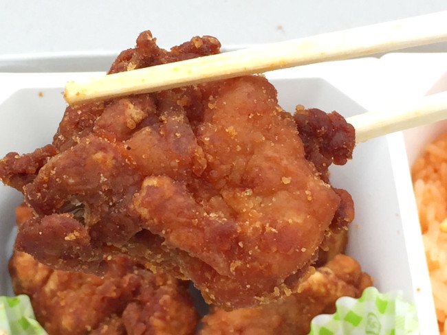 最棒的就是加入蕃茄醬的炒飯和炸雞塊搭配出來的滋味。這種組合很少見,卻很對味。因為有加入檸檬汁,所以吃一吃味道還會有變化,真的挺不賴的。報導刊出的當天聽說這個便當賣得很好,中午的量在比平常還要早的時間就賣完了。搭新幹線的時候也可以買來吃吃看,應該會是個不錯的選擇。
