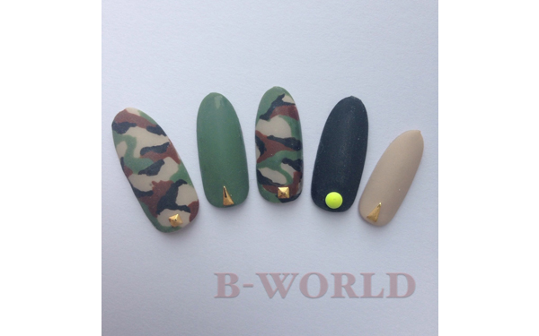 採用軍裝色的美甲設計。採用大有人氣的迷彩服花紋,用厚墊最後加工。