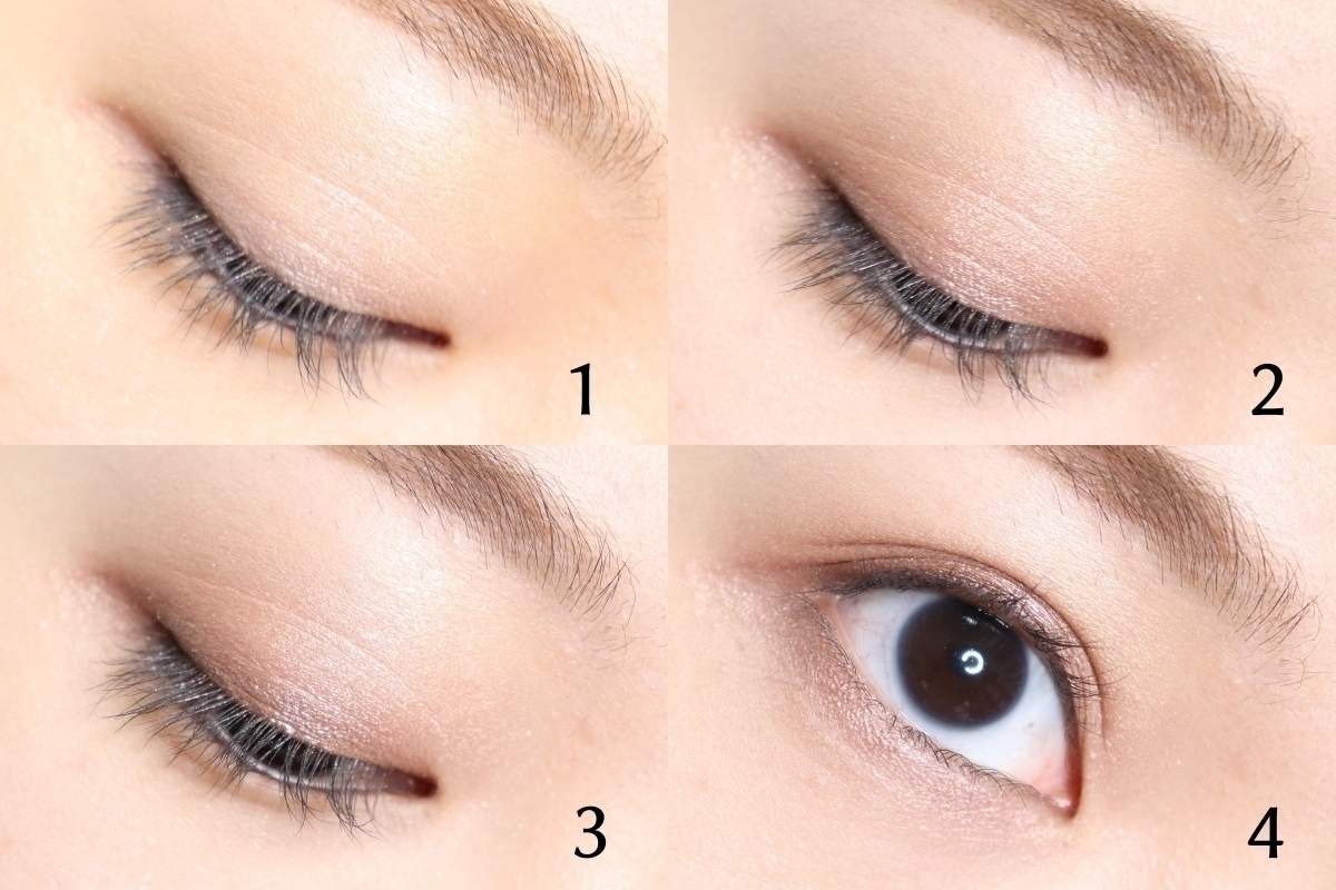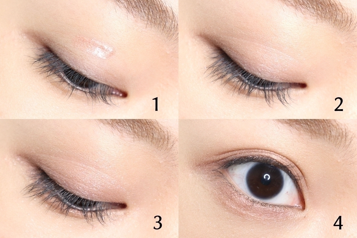 (2)比起用拍打的,眼影膏更適合用指尖輕輕劃開,增加眼影貼合度,就能打造不易結塊的完美眼妝♡(3)接著在雙眼皮的部分,疊上棕色系的BE882。加點暗色系眼影可以利用陰影效果營造大眼魅力♡(4)最後再將PK884塗在下眼瞼的部分,再用小指頭將BE882輕輕塗在眼尾就完成囉。