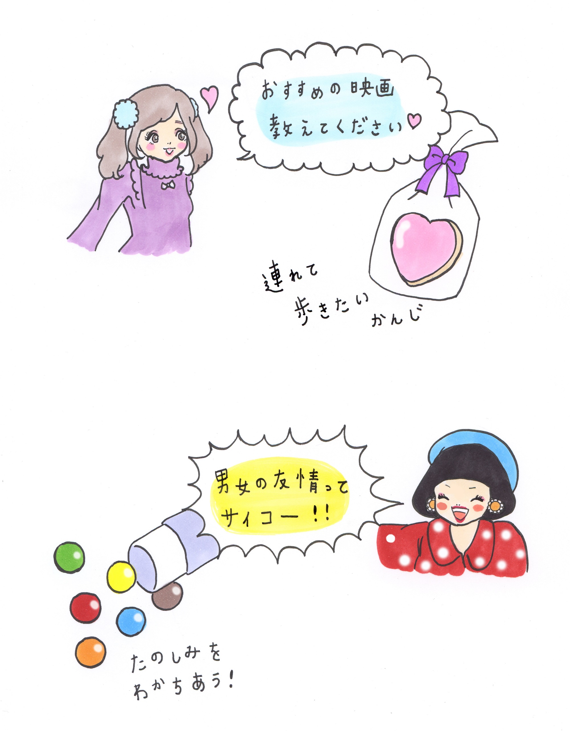和比較中性的男子去時髦的咖啡廳、看獨立系的電影,談論戀愛的煩惱等等。