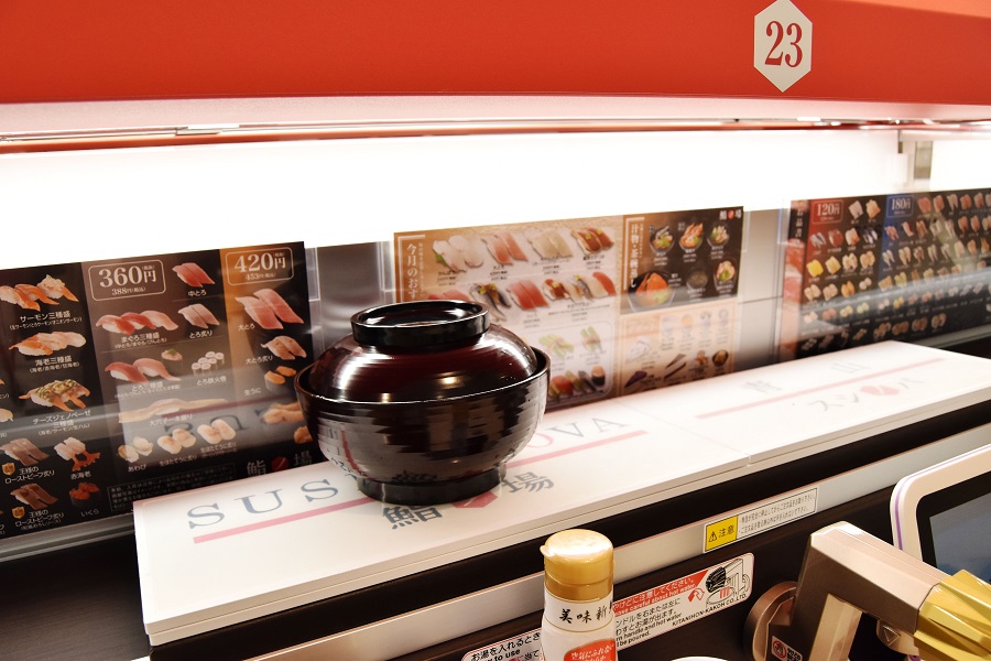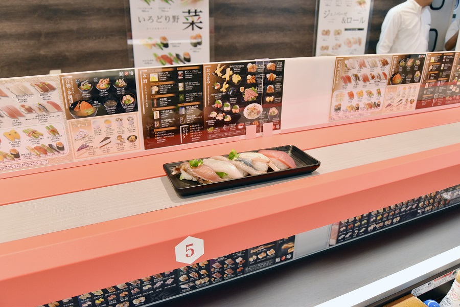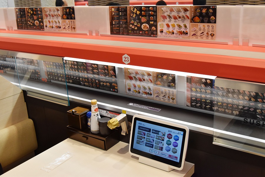 上層是壽司專用的新型特急跑道,下層是運送碗裝料理的跑道。點餐基本上是在置於座位上的觸控螢幕上進行,點餐紀錄會留存於電腦終端,所以店員在結帳時也不用去計算盤子數。