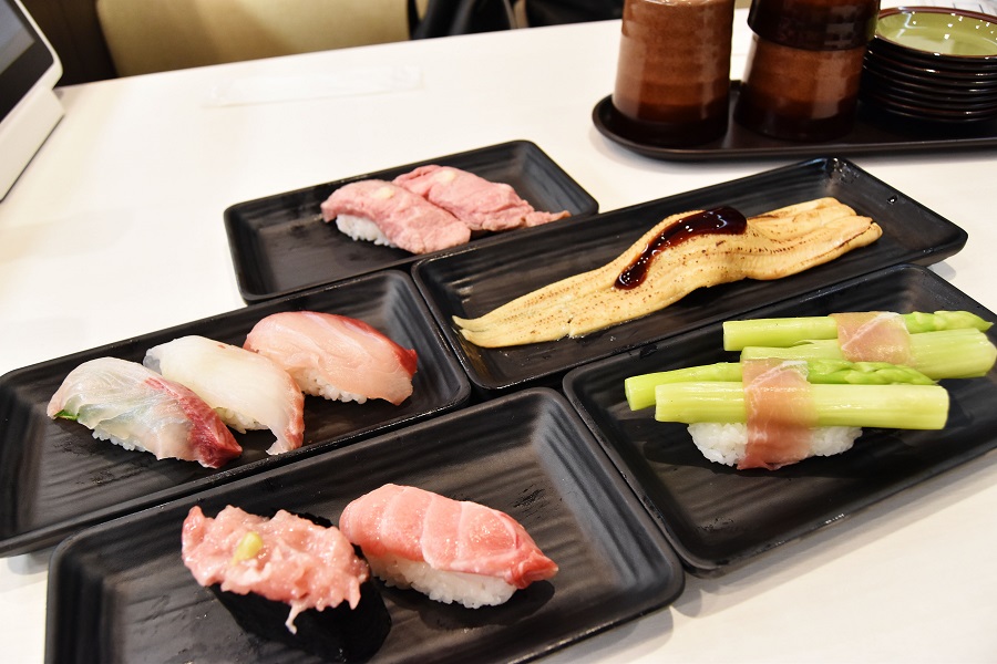 使用觸控螢幕進行點餐後,不到5分鐘壽司就送來了。在跑道上運送的速度也很快,特急跑道這個名稱果真不假。