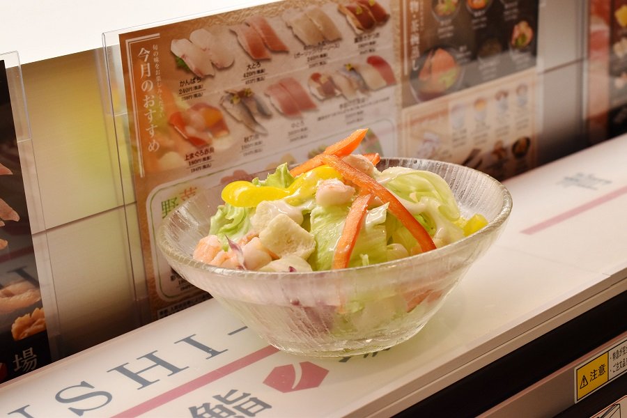 這家店,對於使用蔬菜的品項也很用心,吃壽司還可以邊攝取到蔬菜這點很討喜。沙拉是凱薩風味,黃色和紅色甜椒的壽司是青醬風味,兩種皆是吃起來很有趣的味道。