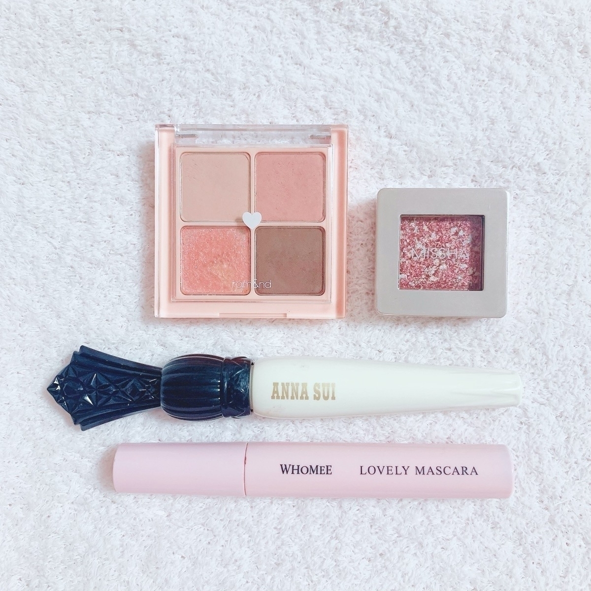 眼妝推薦選擇可以打造出透明感的淡粉紅或是珊瑚色調。這次使用了眼影盤中的亮粉眼影,並加上含有粉紅色亮粉的單色眼影,畫在上眼皮的部分。眼線用眼影中最深的咖啡色,延長眼尾的線條。最後則是只在上睫毛的部分塗上赤陶粉色的睫毛膏!