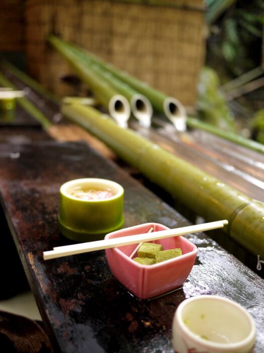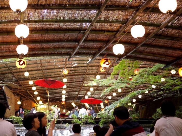 距離河川水面只有一公尺多的距離,光是走進來坐下,就讓你涼意滿滿! 如果你還沒有體會過那捕捉消縱即逝麵糰的刺激感,未來夏天到京都,請一定要去貴船吃吃看傳說中的「川床」流水細麵:不僅僅是流水細麵,還給你配上京都的「川床」文化,在河川上搭了榻榻米,讓你直接在淅淅漱漱響著的川水上吃流水細麵,讓你除了舌頭涼快,連身體與聽覺都涼快了起來。