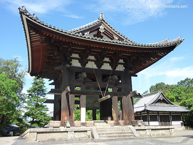 東大寺也稱為「金光明四天王護國之寺」,是由信奉佛教的日本聖武天皇在728年大筆投資興建,距今約有1,200餘年的歷史。東大寺的鐘高385cm,直徑271cm,重量26.4噸,亦為日本文化展物國寶之一。