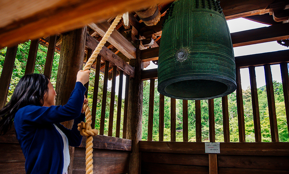 園城寺的鐘「三井的晚鐘」建於西元1602年,高度為155.2 cm、直徑124.8公分、重達2,250千克,鐘表面有108凸起狀,普遍被人們認為除去108種煩惱的象徵,也是此鐘一大特色!