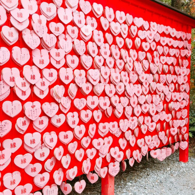 一走近姬龜神社,就能看見掛滿整個奉納所的粉紅色心型繪馬,就像滿開的櫻花佔據了目光,可以感受到滿滿的戀愛能量!