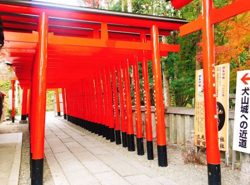 此外,由於所在地是三光稻荷神社,在心型繪馬牆正對面就是千本鳥居,穿過這道千本鳥居,就能來到國寶犬山城的入口,拾階而上,探訪這座美麗的國寶犬山城,再到城下町的街道逛逛,就是相當愜意又舒適的一日遊行程囉!