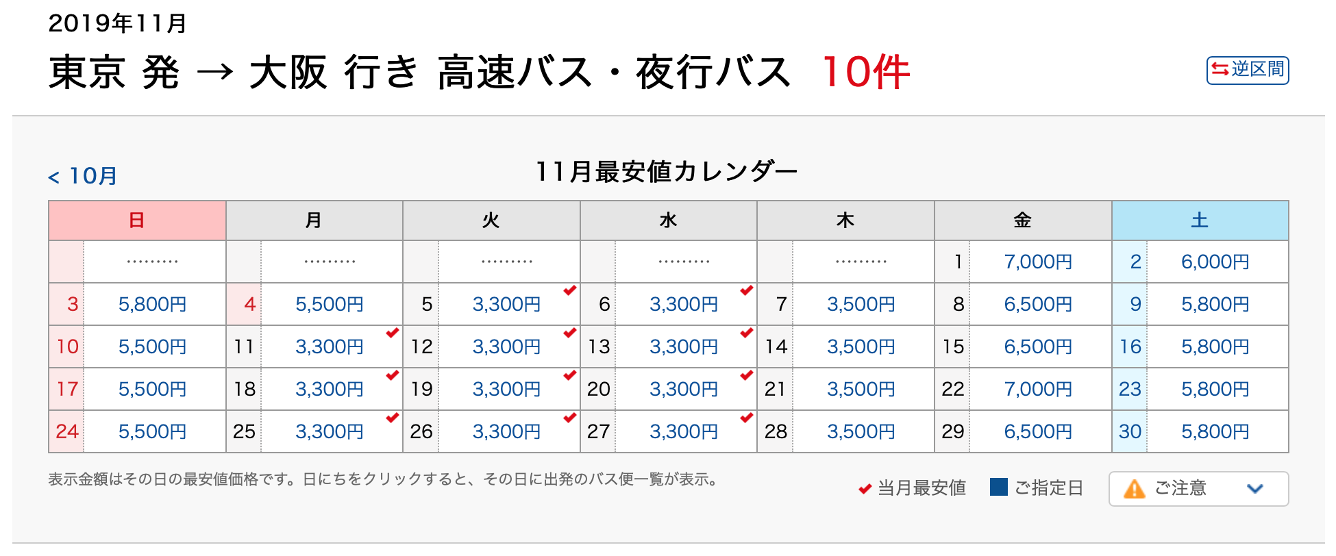 大部分的巴士在兩三個月前就會開放預約,只要在選單中選擇出發地、目的地以及日期(日期未定也能選擇一整個月),並且選擇想搭乘日間(昼行便)或是夜間(夜行便)行駛的車班,就能叫出所有符合的車班。