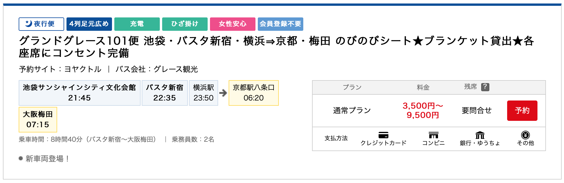 而搜尋結果中的車班資訊則是清楚列出了所有停靠地點,以及車上設施:四列寬敞座位(四列足元広め)、充電、毛毯(ひざ掛け)、女性安心座位(自動安排鄰座為同性別乘客),以及非會員預約制。