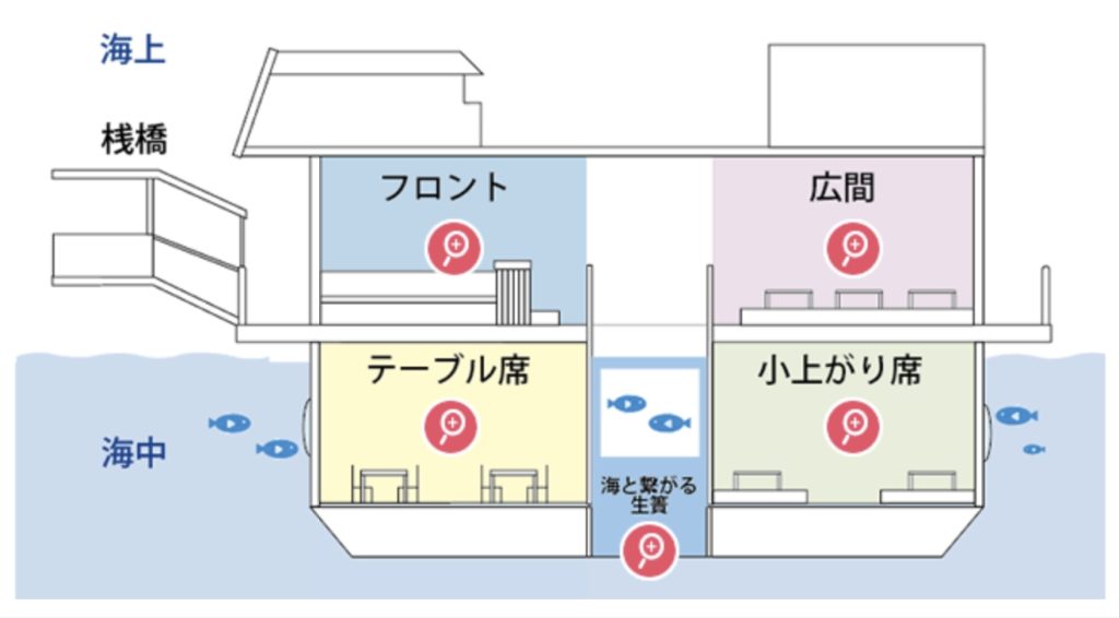 他們的餐廳有兩家,一家是在呼子朝市附近,另一家位於加部島對面,是比較有特色的海中餐廳。