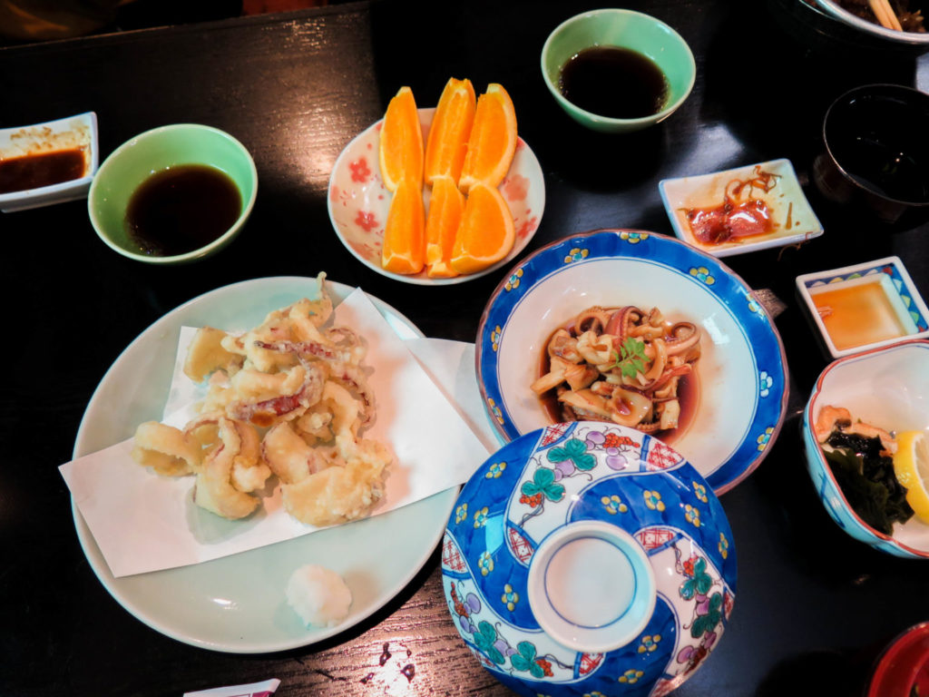 這個花枝套餐是以一個人做單位的,內容物有前菜、花枝刺身、花枝燒賣、花枝鬚天婦羅、白飯、湯、漬物跟甜點。