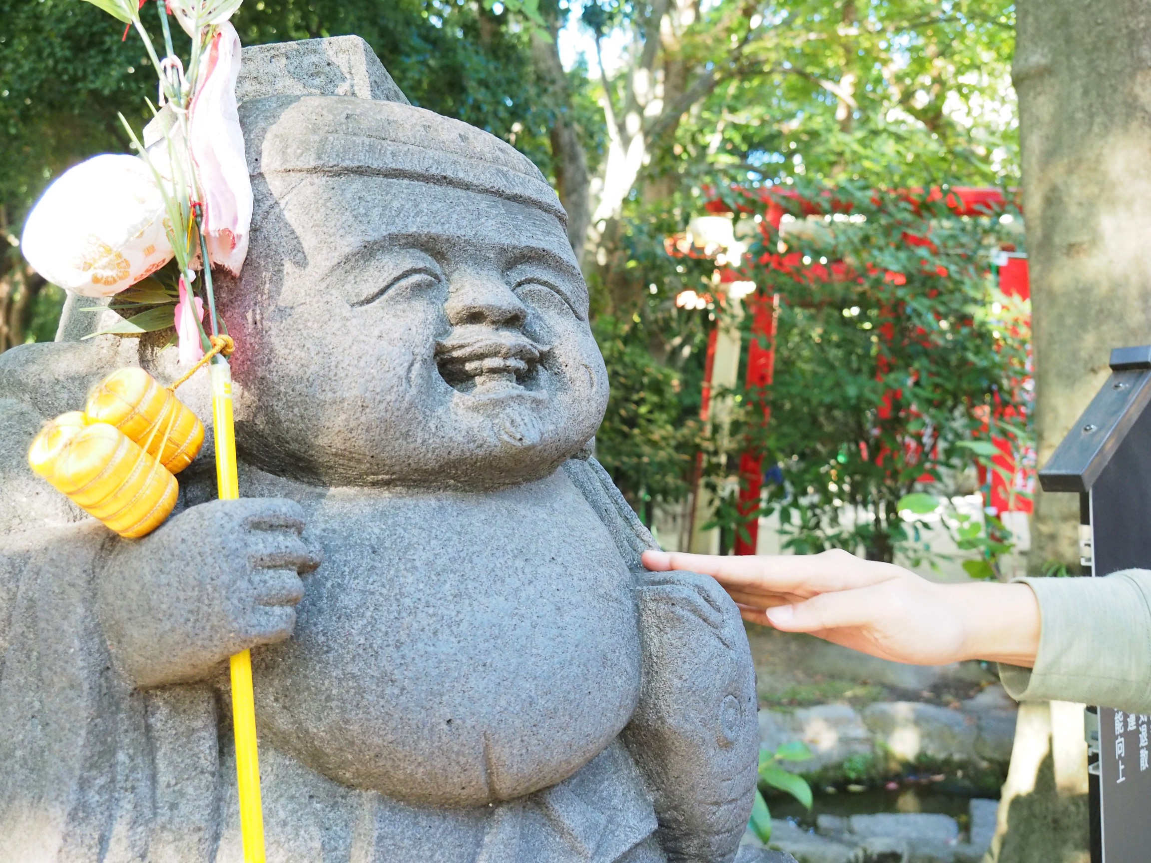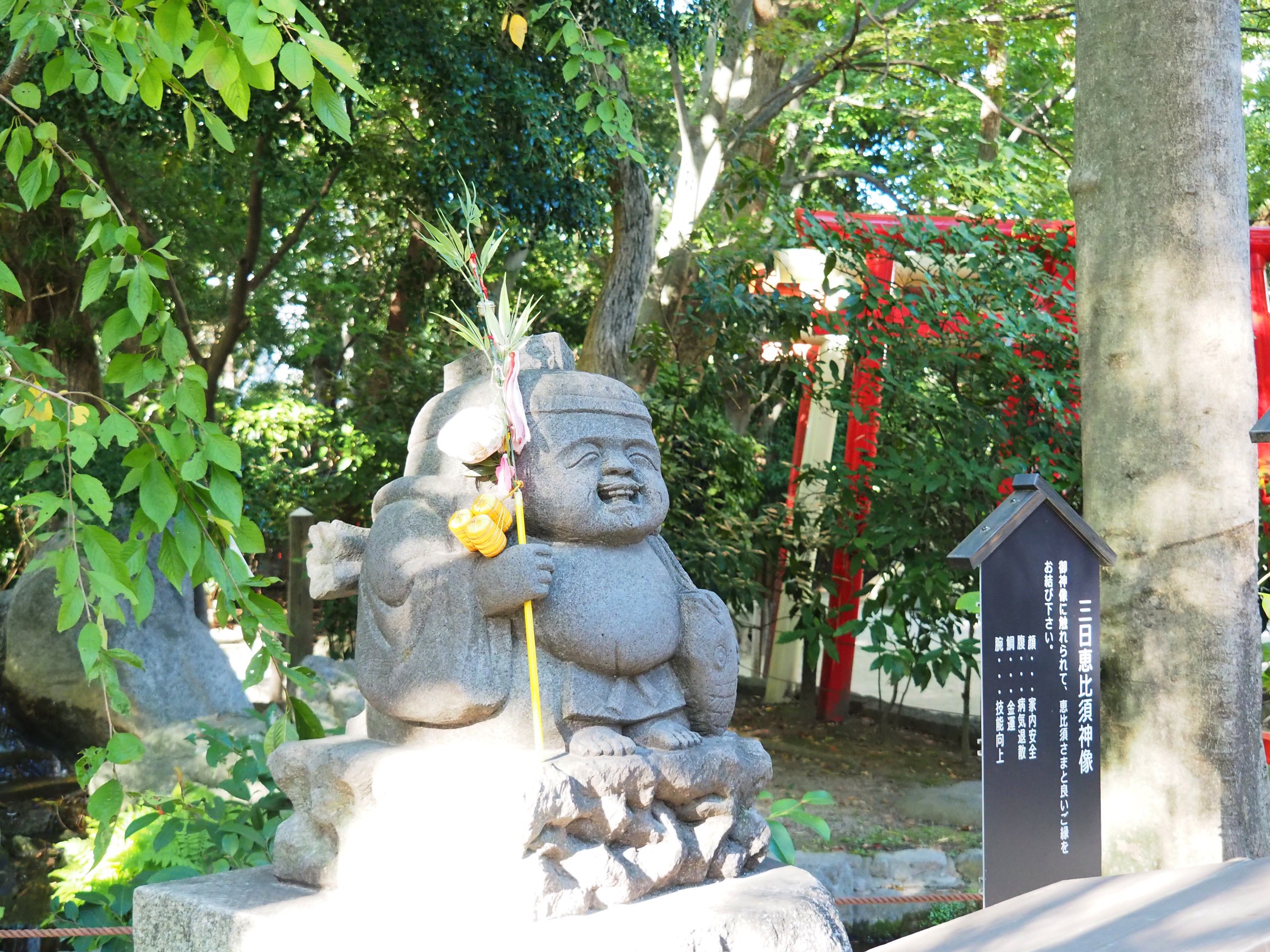 神社內還有著一尊圓潤可愛的惠比須神像,頭上戴著烏紗帽、身穿古時的狩衣,右手拿釣竿、左手抱鯛魚,就像是古時的老爺爺和藹溫柔的笑容和造型。 湊近一看會看到一旁的告示寫著觸摸惠比須神像不同的身體部位可以獲得不同祝福。