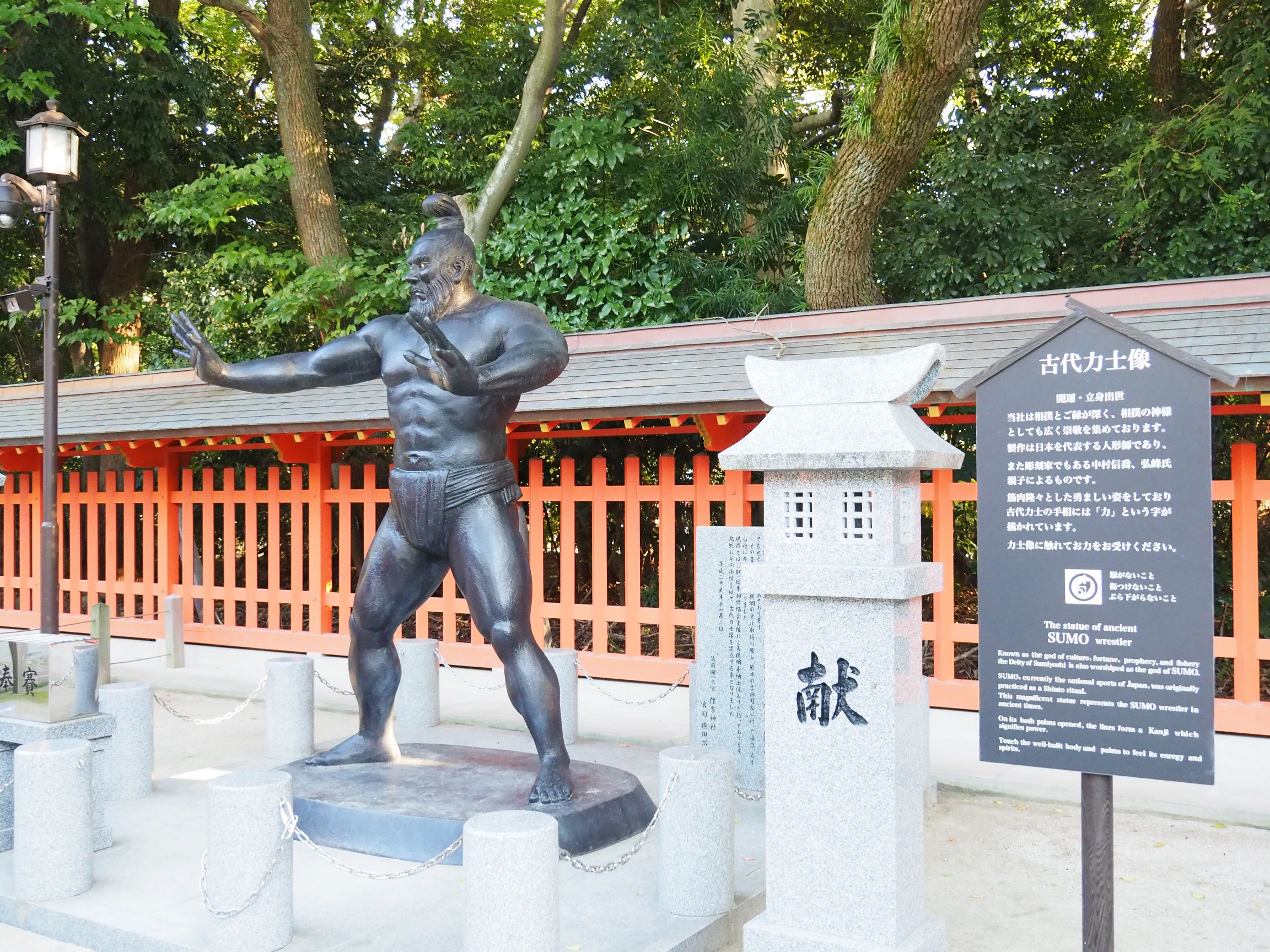 住吉神社也是相撲神祇的神社,殿內有尊氣勢宏大、比一般人還高大的「古代力士像」,據說將手放在古代力士像的手上就可以獲得力量。