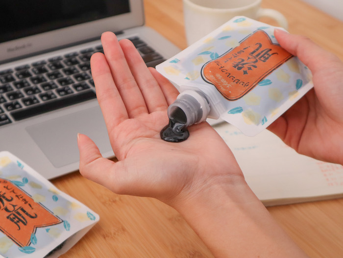 這款「御洗肌溫感炭洗卸凝膠」由於是主打炭,本體是黑漆漆但有一點膠狀的,擠出一粒葡萄大小即可使用,可以肉眼就看到由炭為主體的「御洗肌」凝膠中微小的顆粒!跟洗卸常見的使用方式一樣,手與臉保持乾燥,直接使用輕輕按摩臉部將彩妝溶解,使用一些水分重複按摩到完全乳化後就能用清水洗淨。