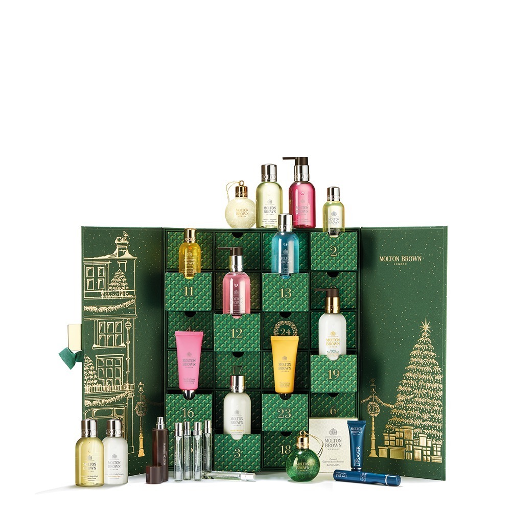來自倫敦的保養品牌「MOLTON BROWN」全產品選用天然植物配方,獲得眾多高級飯店青睞,並在英國獲得了皇家認證。 MOLTON BROWN推出的2021耶誕倒數月曆以綠色為主視覺,24項倒數產品包含了今年耶誕限定新品「歡慶松樹與廣藿香系列」,以及品牌最有名的沐浴品、香氛蠟燭、身體乳液、護手霜等,小包裝可隨身攜帶,非常方便。