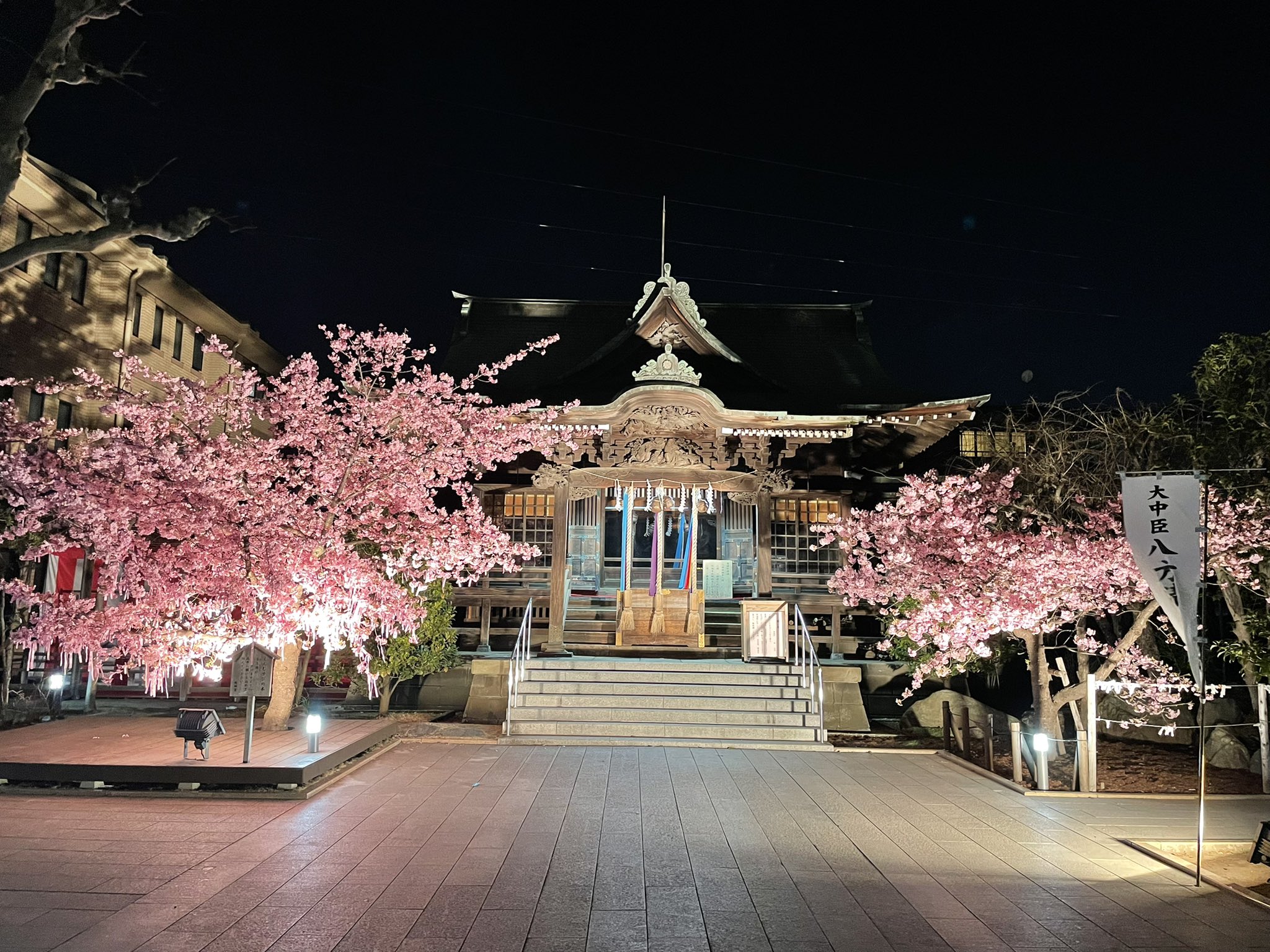 櫻神宮也會在河津櫻滿開前後的夜間打燈,並開放讓民眾參觀夜櫻,往往也吸引相當多的民眾來拍攝滿開的夜間河津櫻,有別於白天的一番美麗景色。