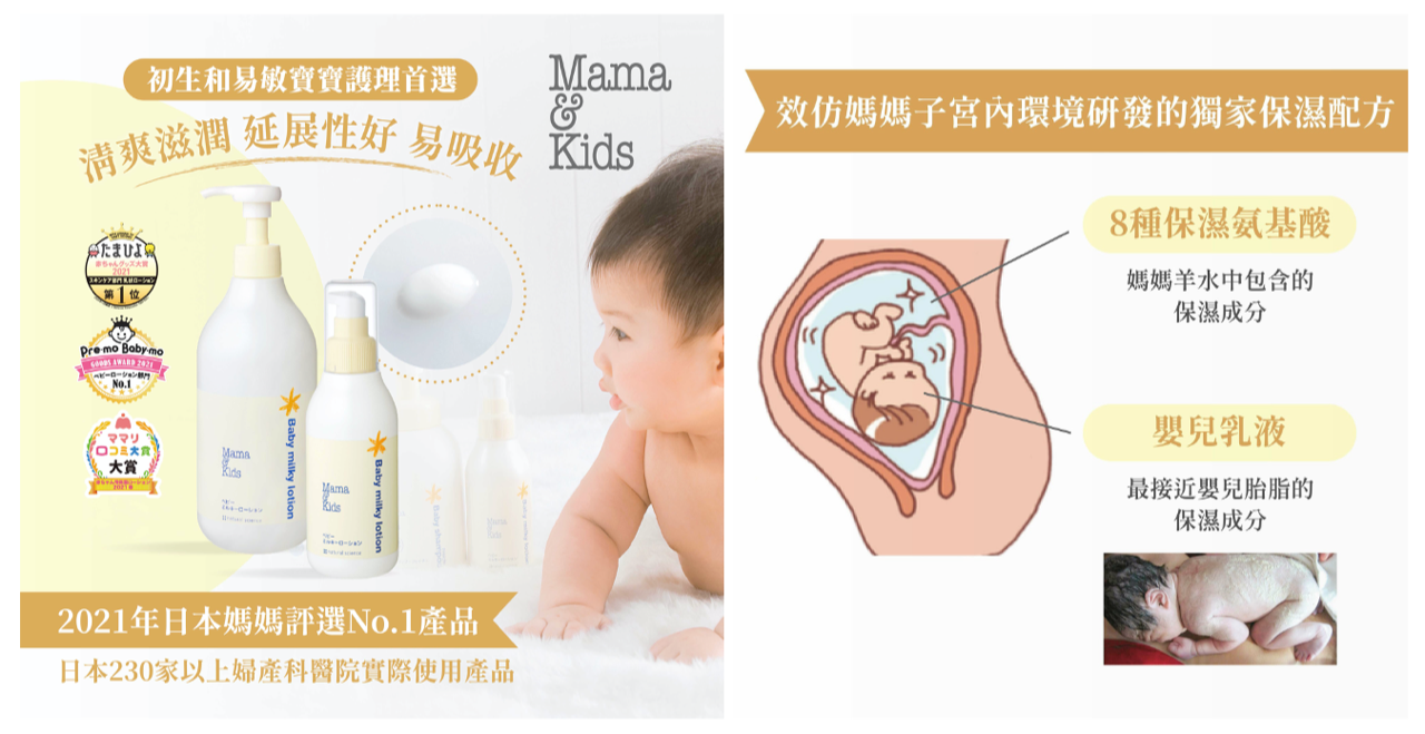 Mama & Kids 「嬰兒保濕乳液」不只能用在寶寶身體, 容易乾燥的臉部肌膚也能每天使用!臉部與身體肌膚保濕一 瓶搞定,尤其季節轉換跟寒冷冬季最需要每天加強保養,初生寶寶就能安心使用。專為寶寶設計研發「仿胎脂成分」,效仿媽媽子宮環境的專利保濕配方,最適合剛出生的嬰兒,更添加 8 種保濕氨基酸,讓嬌嫩的肌膚瞬間吸收,肌膚 0 負擔。