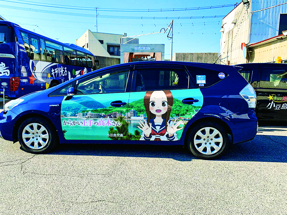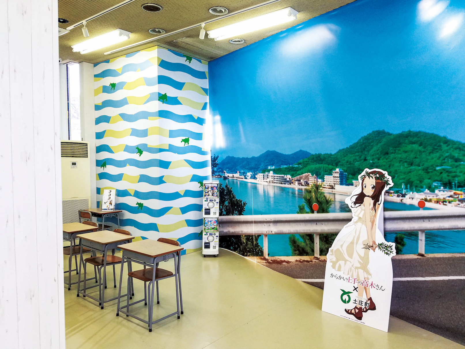 從高松搭渡輪1小時可到小豆島的土庄港,渡輪船首側面左右都貼有青春洋溢的高木同學畫像迎接著乘客,船艙內更是到處可見高木與男主角西片以及同班同學真野、中井、美奈、早苗、友加里等人表情豐富的圖片,這1小時的船程感覺好像與高木同學一起開同學會,一點都不會無聊,到了土庄港,二頭的港口內休憩處被規畫成為動漫的「情報發佈土庄基地」,除了展示各種相關資訊外,還有等身大的高木同學立像和動畫裡的教室裡的課桌椅、黑板等,讓你一秒跳進了漫畫世界,不妨一起拍照留念吧!出了港口還有車身彩繪著高木同學的計程車等著載你小豆島趴趴走呢!