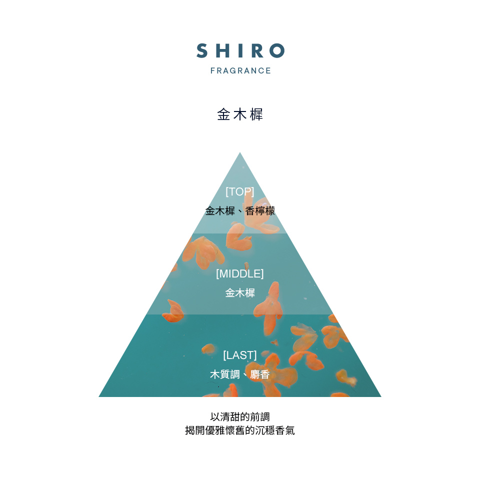 金木樨聽起來有些異國風情的名稱,其實就是桂花,與台灣常見的白色桂花不同金木樨為橙色花朵的丹桂,一年開花的時間不到10天。SHIRO將金木樨的甜味交疊清新經典的香檸檬,使前調的甜味更加的通透不單調,中調則是只使用金木樨來傳遞出最純粹的金木樨香氣,後調搭配柔和不搶風采的木質調香氣及麝香為馥郁甜美的金木樨更添一抹溫柔似棉花般的溫潤香氣,使用的同時立刻化身為人間金木樨。