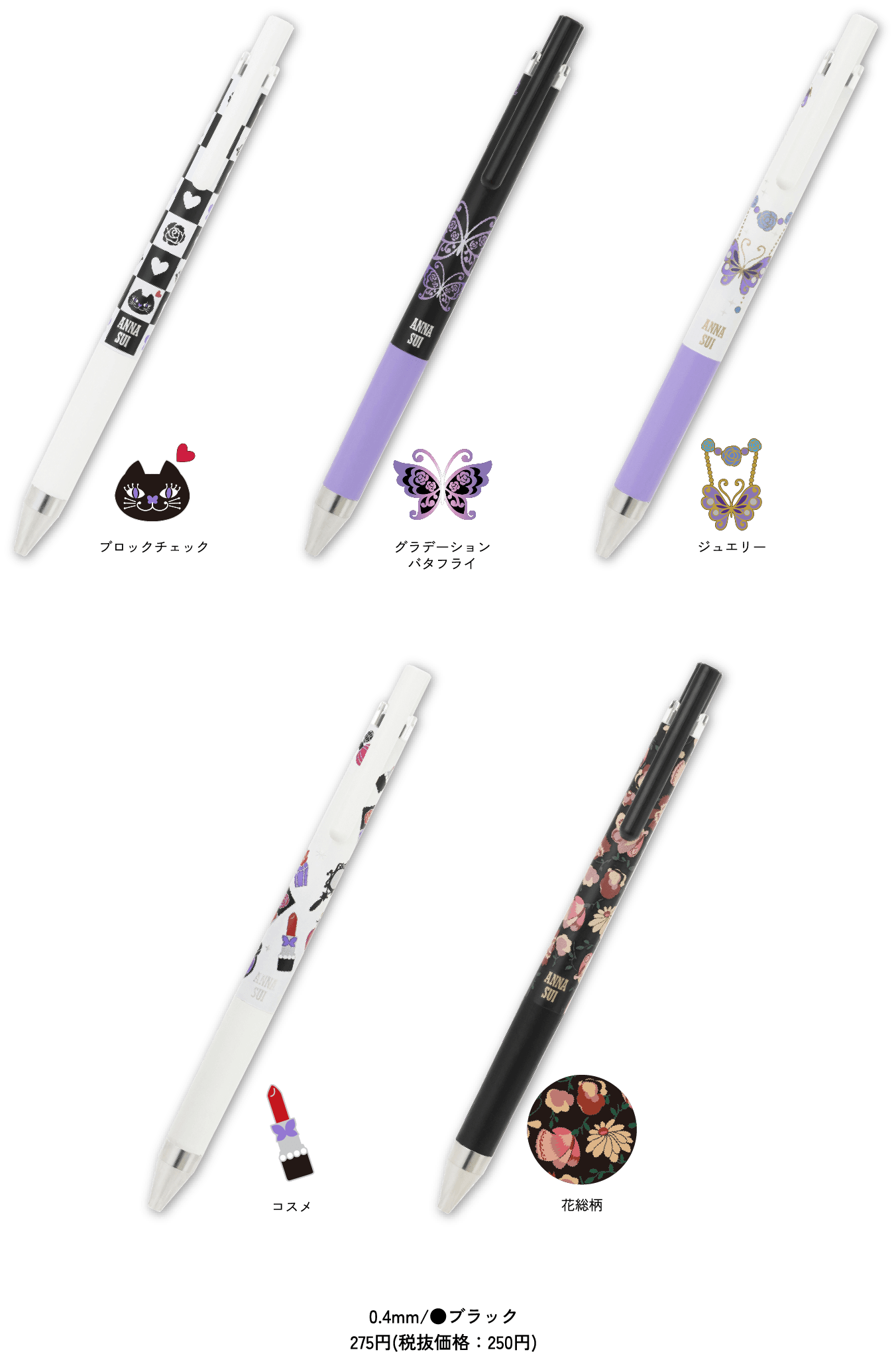 ■ ANNA SUI 超級果汁筆/ANNA SUI×ジュースアップ,0.4mm、單一黑色、五款筆管,各275日圓。