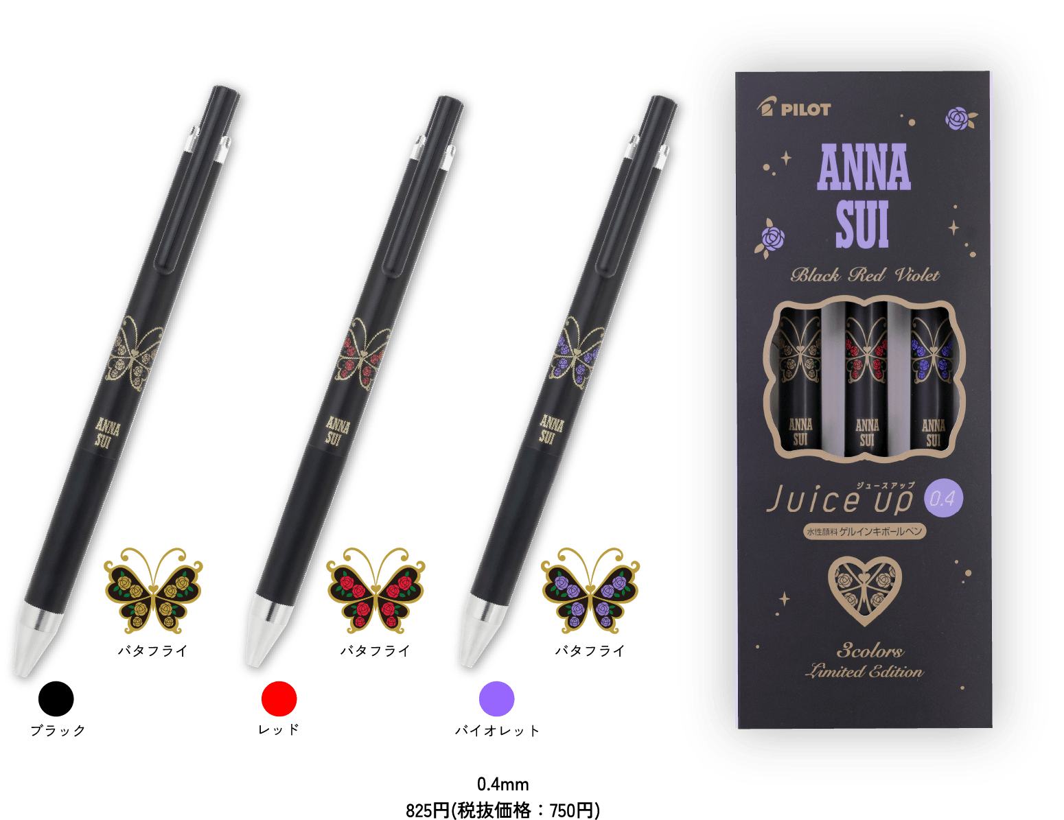 ANNA SUI與PILOT跨界聯名繼去年大好評的「HI-TEC C 超細變芯筆」後推出第二彈超級果汁筆以及多色果汁筆,書寫滑順再進化的超級果汁筆擁有更加耐水耐光的進化墨水,金屬筆尖使施力更穩更順暢,搭配ANNA SUI超搶眼的百變筆管,滿滿的玫瑰、愛心、蝴蝶與貓咪讓例行公事不再枯燥乏味,提高書寫樂趣。