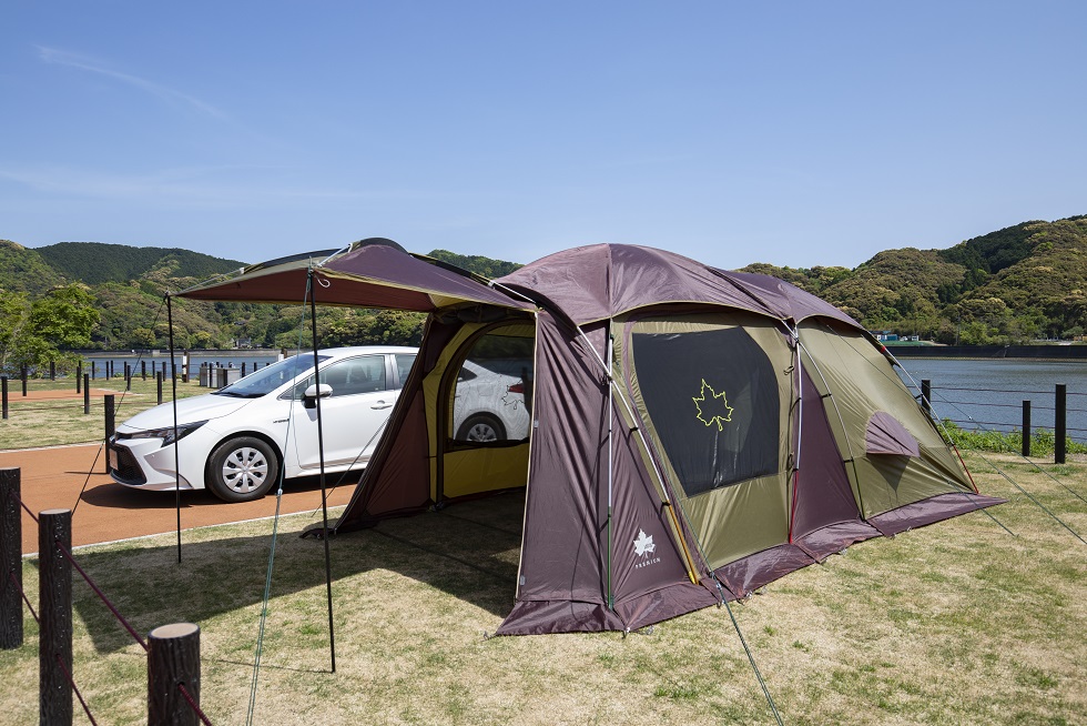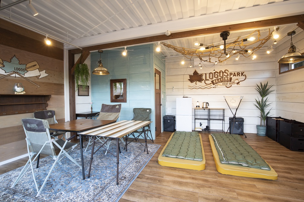 比鄰海灣的露營廣場有19個自由扎營點及4棟不同風格的貨櫃屋。自由扎營點均提供空手露營(MY FIRST LOGOS)方案(內含帳篷、床墊、睡袋及烤肉設備等)。貨櫃屋內則均附有空調、衛浴及冰箱及LOGOS原創露營小物供使用。外國旅客也可以輕鬆體驗露營樂趣!然而為了讓旅客充分感受自然的聲音,營區內禁止播放音樂。